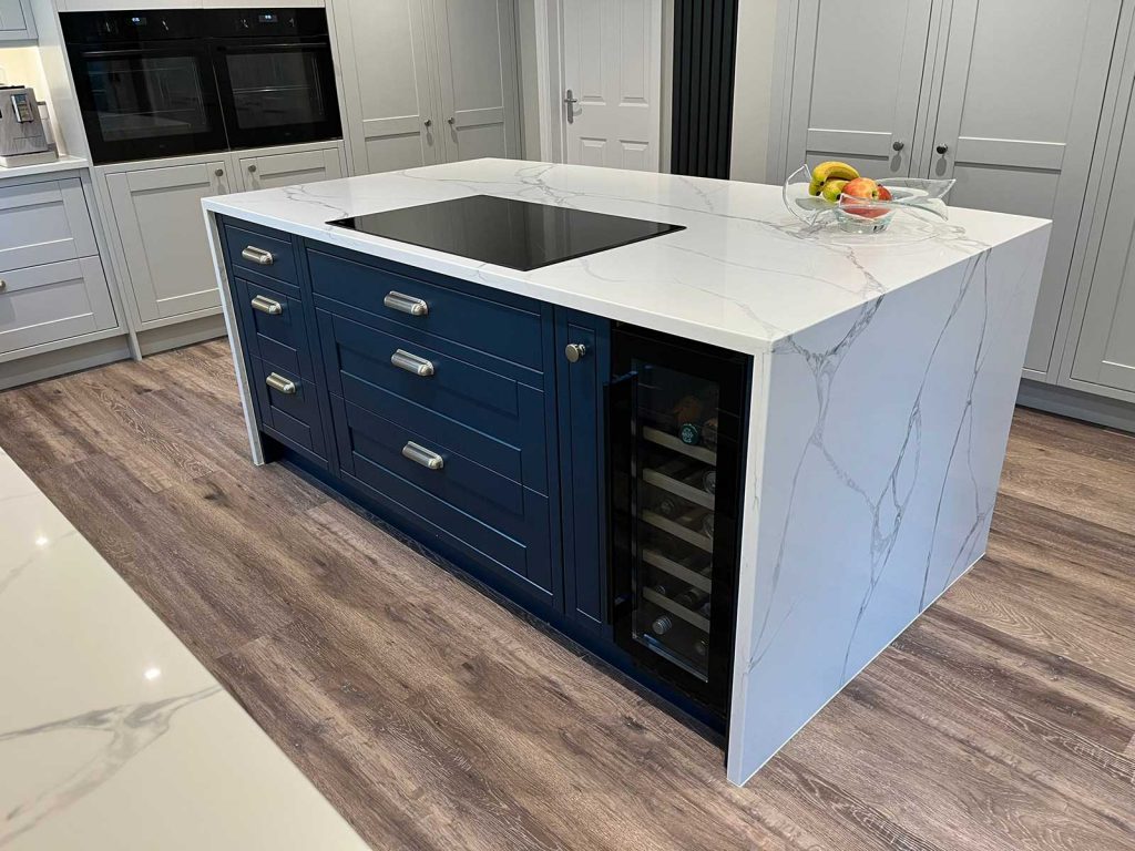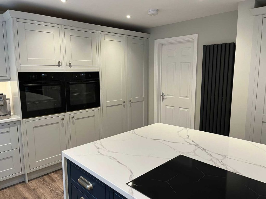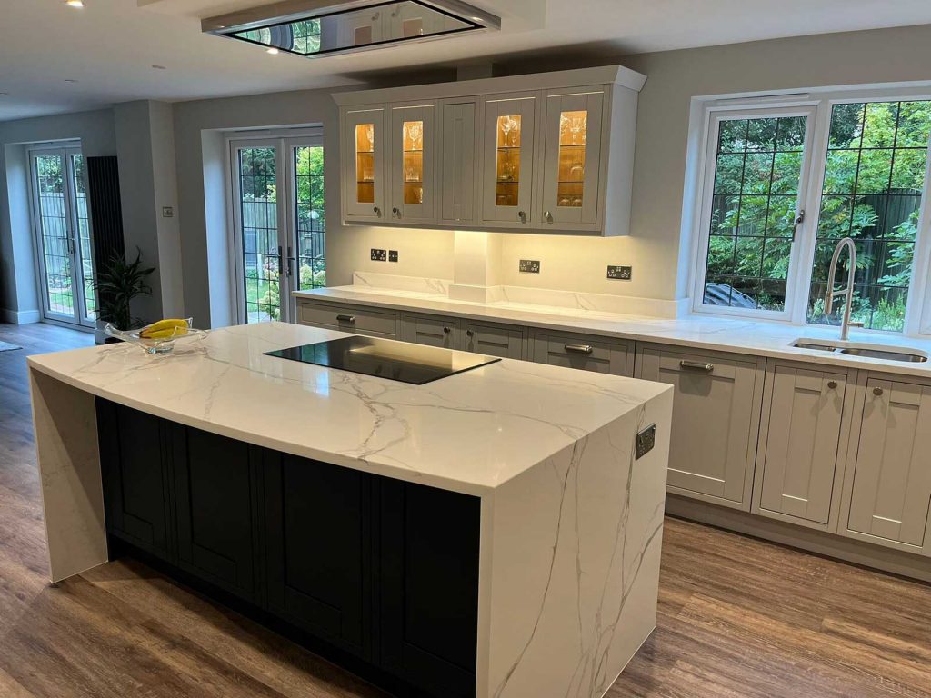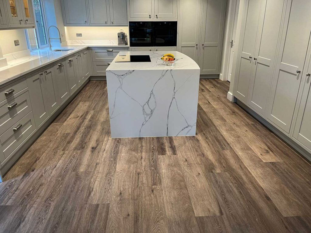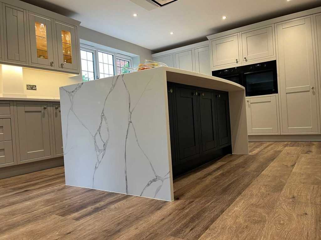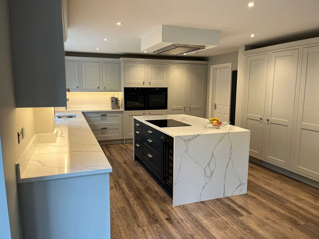 We delivered a contemporary kitchen that balances function and elegance. A striking marble-effect island forms the focal point, paired with clean cabinetry, integrated appliances and warm timber flooring. The reconfigured layout improves flow across the ground floor, while the new utility room adds convenience. The finished space combines modern detailing with a timeless feel, creating a welcoming hub for the home.